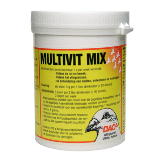 Multivitmix is a high concentrated powder vitamin mix used for the prevention and treatment of vitamin deficiency in racing pigeons. Multivitmix is formulated for birds witch have a vitamin deficient in food, and deficiency caused by treatment of medication.